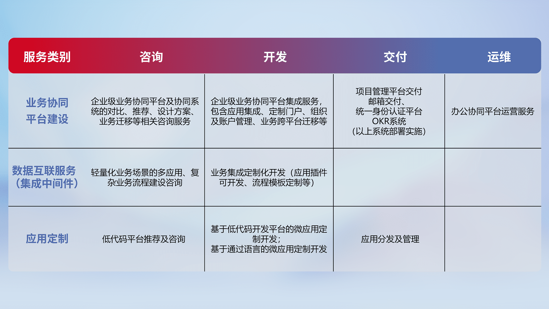 针对钉钉、、企微、、、IDaas等平台级产品提供产品的规划、、、、方案、、、、交付、、定制化开发等服务,,,实现如统一协同办公、、智能客户服务、、混合会议管理、、智能数据查询、、、、等业务场景,,实现数字化转型。。。